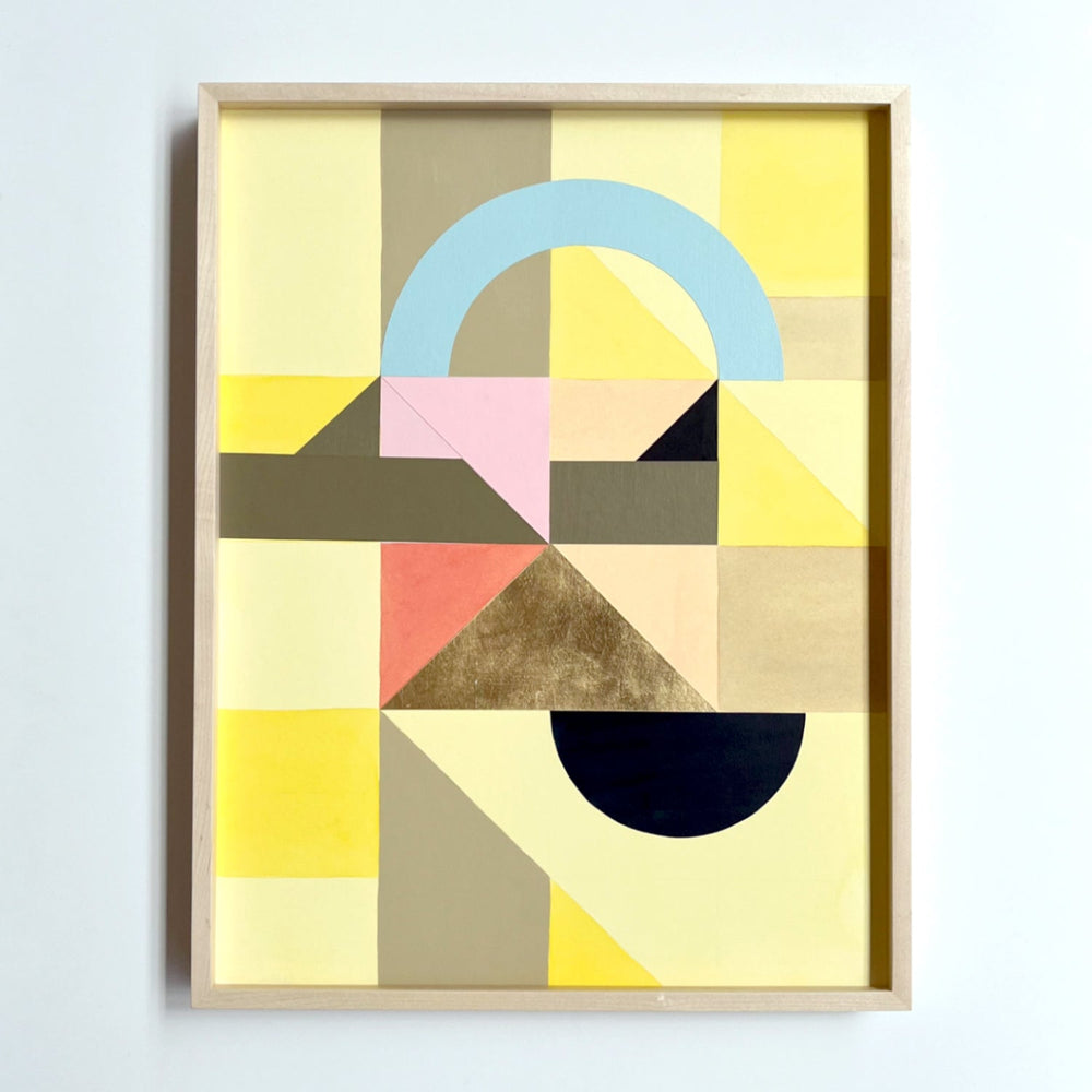 Acrylic, watercolor, gold leaf, and paper collage on cotton rag artboard.