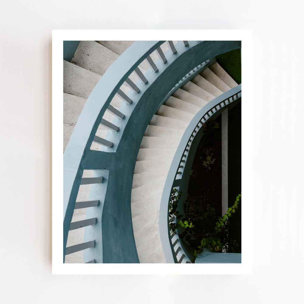 Minimal tondo watercolor with intense teal central shape with comet like quality.